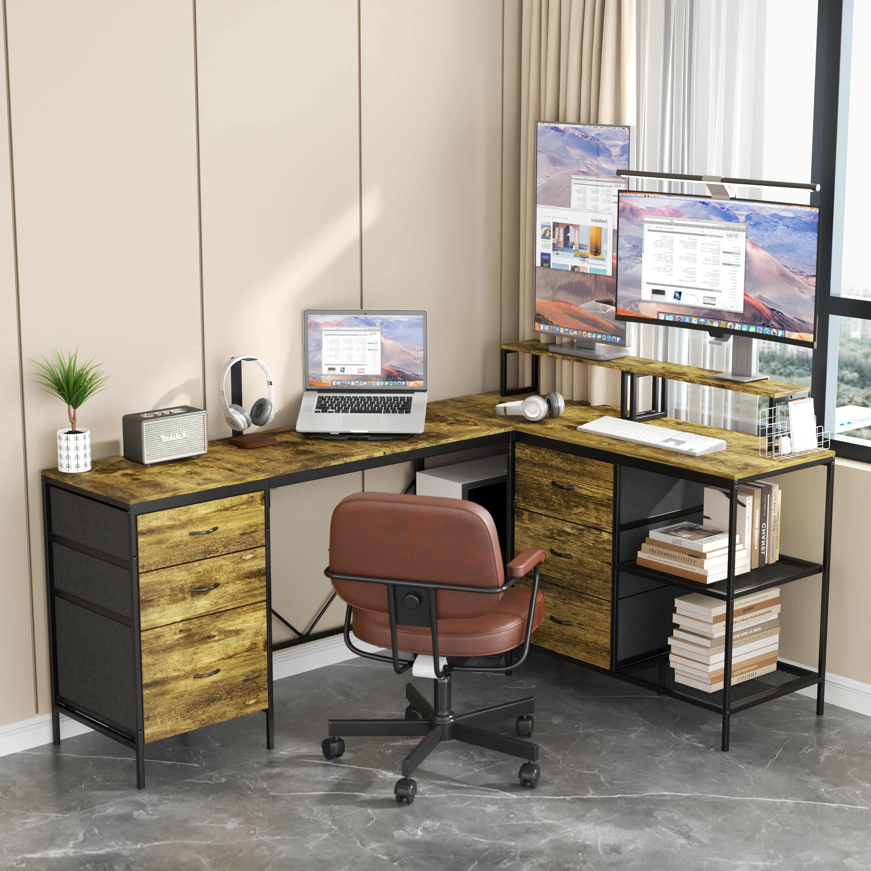 114'' Industrial Rustic Brown L-Shaped Computer Desk with Power Outlets & USB-C