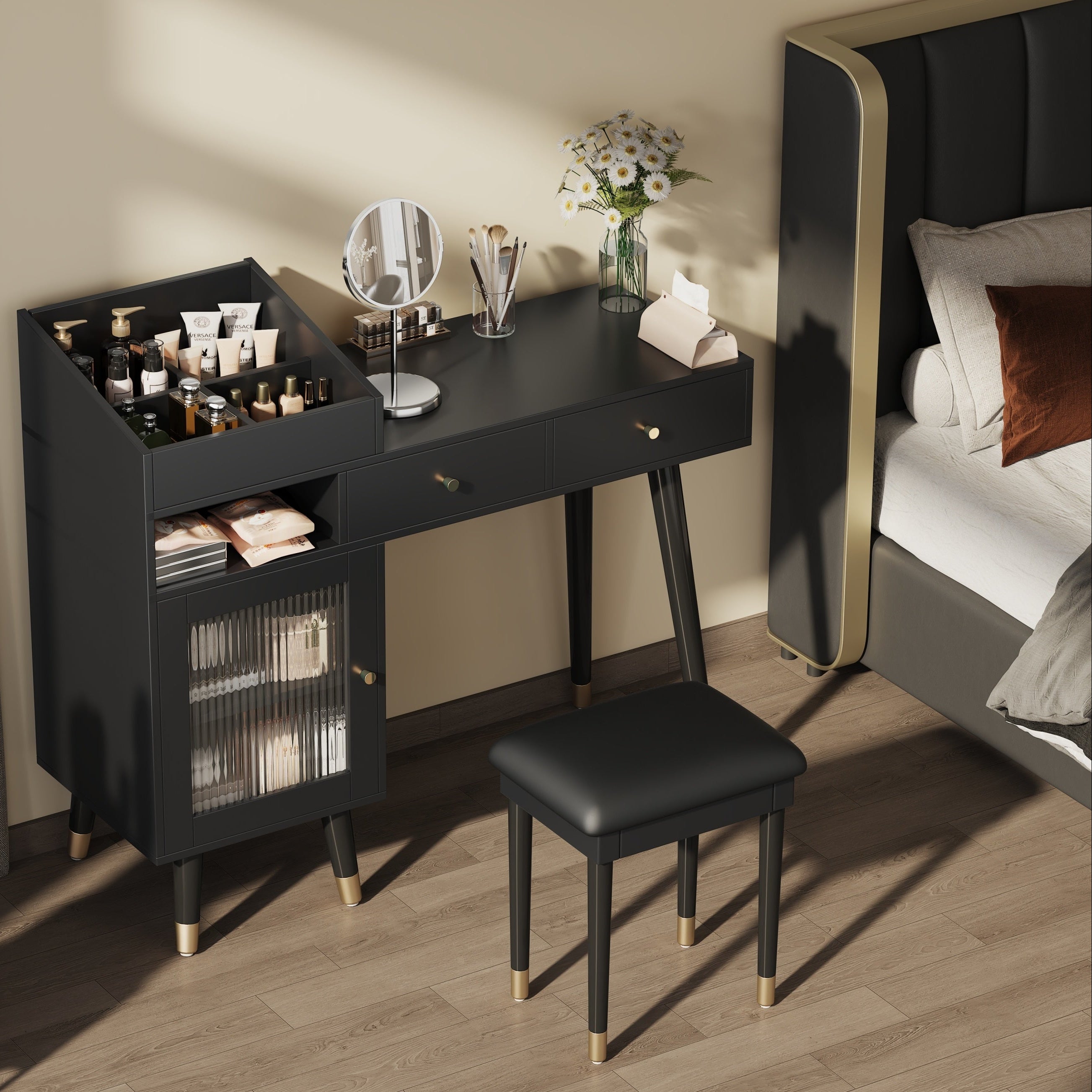 Elegant Black Makeup Vanity Table & Chair Set with Organizer & Charging Port