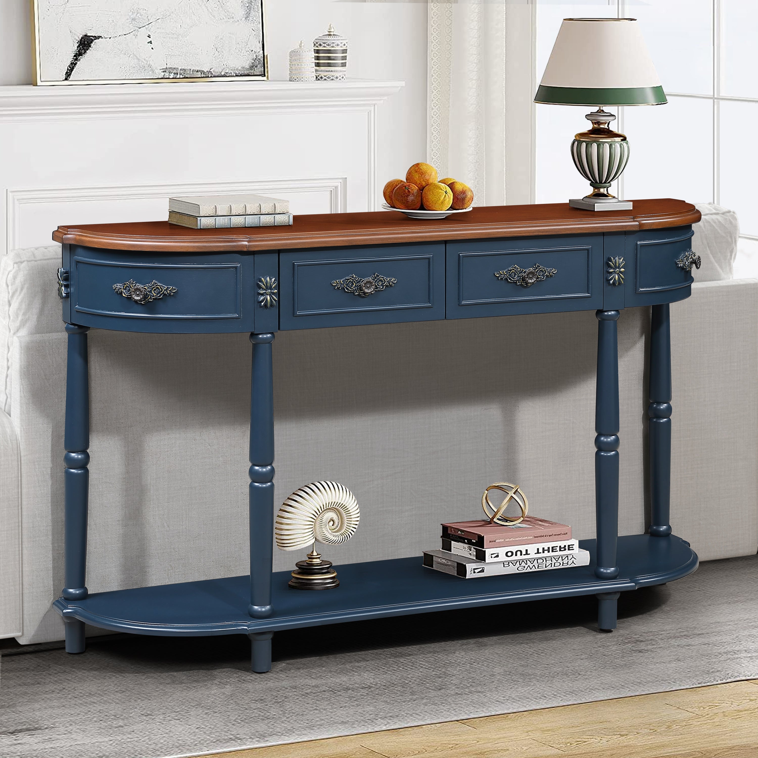 52'' Retro Curved Wood Navy Blue Console Sofa Table with Open Shelf and 2 Drawers