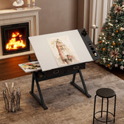 Adjustable White Drawing Drafting Table Desk With Stool 2 Drawers