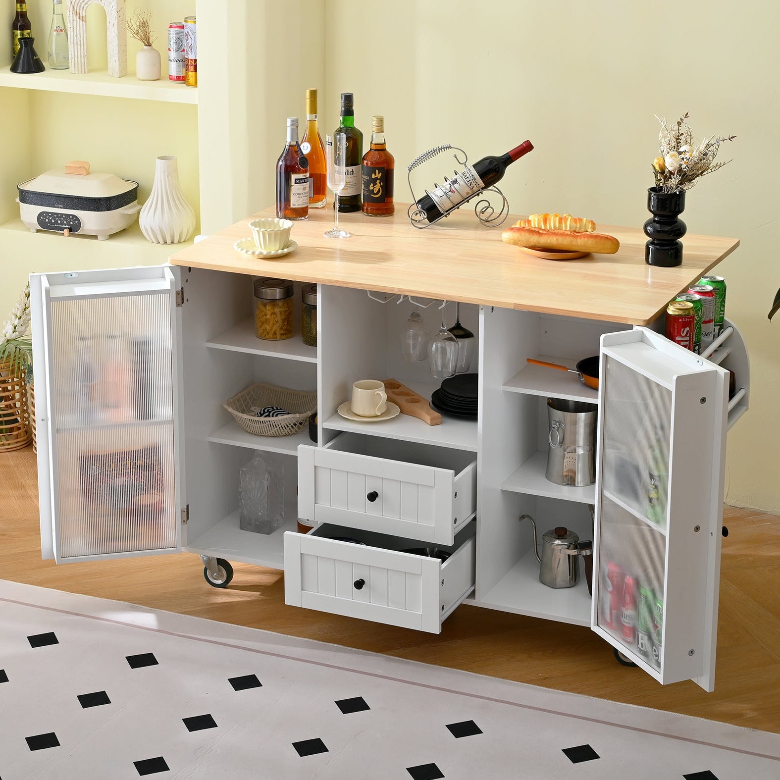51'' Rolling Fluted White Kitchen Island Cart with Drop Leaf Internal Storage Rack